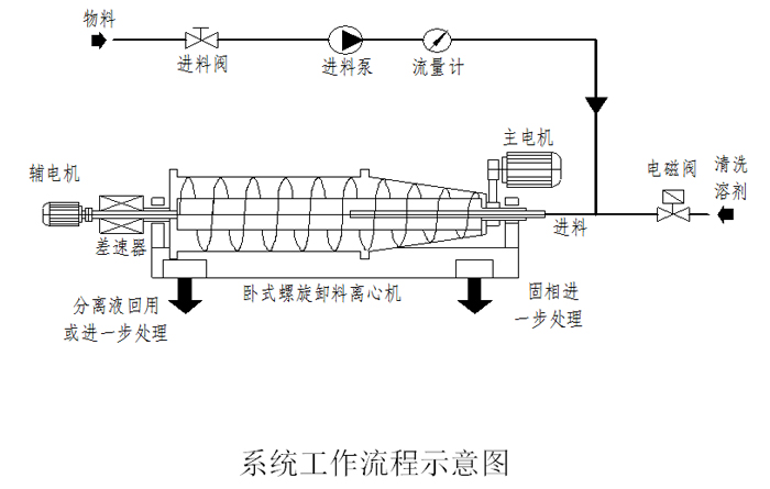 下圖描述了離心機的主要設(shè)備和系統(tǒng)進行工作時的工藝流程,該系統(tǒng)主要包括臥式螺旋卸料沉降離心機(主機)、電器控制系統(tǒng)、無軸輸送機、自動控制加藥系統(tǒng)。