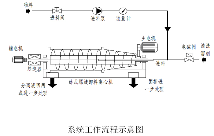 下圖描述了離心機(jī)的主要設(shè)備和系統(tǒng)進(jìn)行工作時的工藝流程,該系統(tǒng)主要包括臥式螺旋卸料沉降離心機(jī)(主機(jī))、電器控制系統(tǒng)、無軸輸送機(jī)、自動控制加藥系統(tǒng)。
